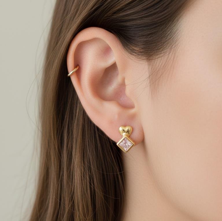3. BRINCO CORAÇÃO COM PINGENTE QUADRADO ZIRCÔNIA BANHO OURO 18K