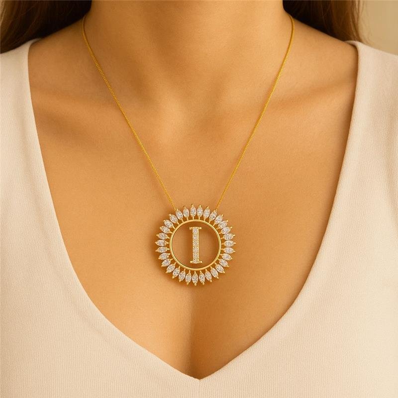 COLAR MANDALA GRANDE COM INICIAL I CRAVEJADA COM ZIRCÔNIAS BANHADO EM OURO 18K